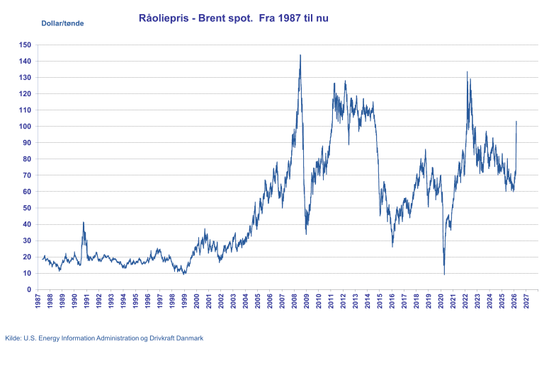 Prisudviklingen på Brent spot vises med to forskellige grafer baseret på de daglige noteringer fra U.S. Energy Information Administration.